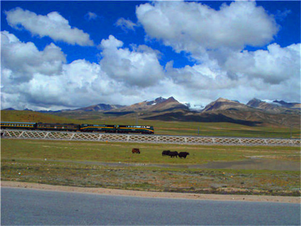 (青藏109国道。在传说中的天路上骑行,风景是这样的美好。高海拨地区,路较平,但车开得不快,时速50公里行驶)